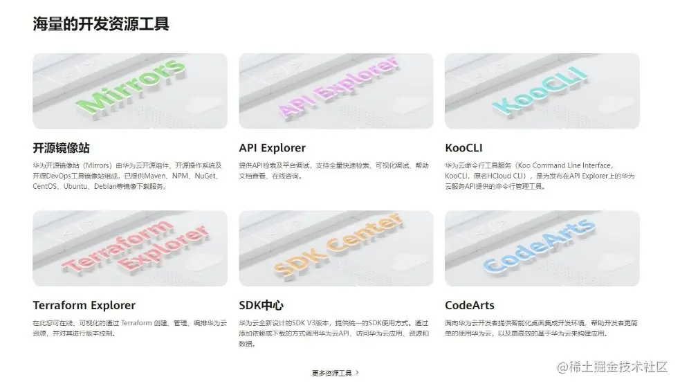 同时,华为云开发者官网围绕开发全流程提供丰富的工具与资源,从开发环境、API调试到云资源的编排管理,让开发者更高效的接入华为云生态,管理华为云资源,基于华为云构建应用,快速实现应用的创新。