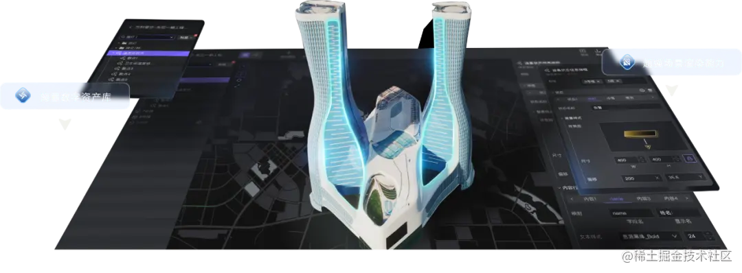通过大数据开发及治理平台DTinsight和低代码数据协作平台DTable,实现数据治理与开发,为企业打造数据底板,支撑数字孪生场景的呈现,配合EasyX系列工具矩阵,解决数字孪生建设在三维场景渲染、自定义地图数据获取、BIM轻量化、业务场景协同、云渲染等难点;通过自研的EasyTwin数字孪生融合渲染引擎,能够以低成本SaaS的形式为客户提供服务,实现实时渲染与数据融合;数字孪生可视化平台EasyV内置海量组件、模板、素材,通过低代码/零代码的方式,拖拉拽的编辑模式,有效降低可视化建设的的门槛和成本,让用户自主搭建指挥中心、数字化展厅、数字化管理等数字化应用场景。