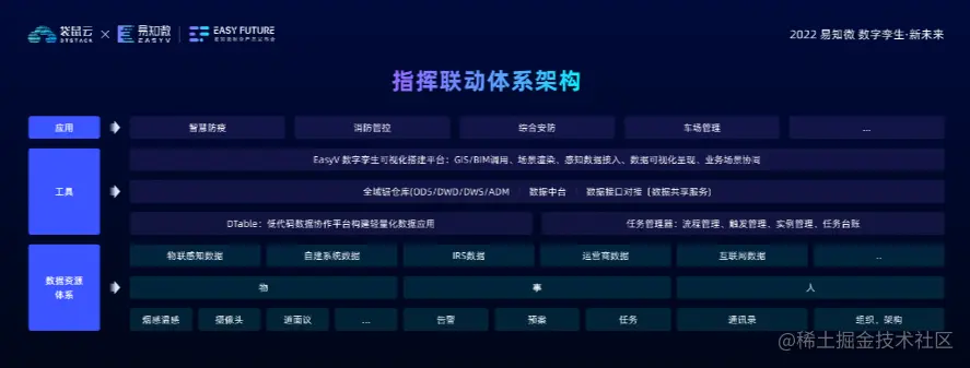 实现“虚实人联动”是从“看见”到“受益”于数字化的关键,该特点就是在虚拟世界中的操作能够在真实物理世界得到反馈,例如,在场景中有个按钮可以远程控制摄像头的方向,或是一个指挥中心的场景,业务决策人发现异常事件后拉起相关负责人发起视频会议作出决策对应的任务下派给一线业务人员,一线业务人员上报情况后,事件处理的结果能在场景中得到反馈。基于此场景需求,我们推出指挥联动体系架构,助力打造“虚实人联动”的数字孪生场景。