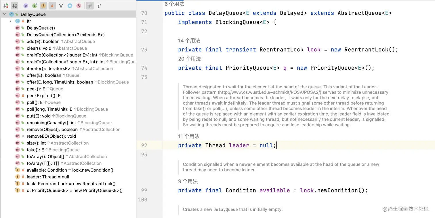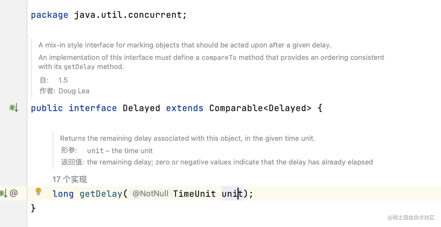 DelayQueue是JDK提供的一个无界队列,我们可以看到,DelayQueue队列中的元素需要实现Delayed,它只提供了一个方法,就是获取过期时间。
