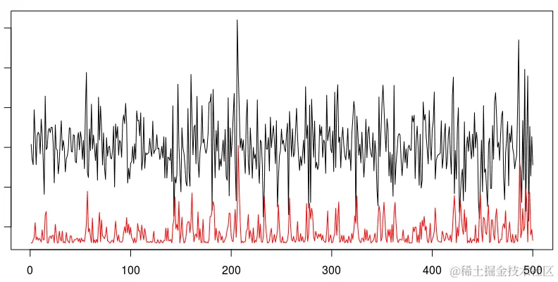 + for (i in 2:n){s2[i]=theta[1]+theta[2]*X[(i-1)]^2+theta[3]*s2[(i-1)]}