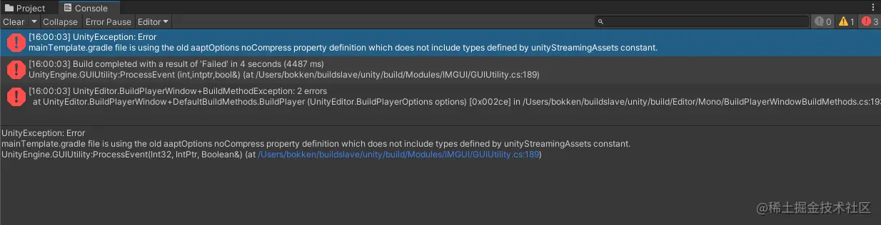 后面报错:无法为com.android.build.gradle.internal.dsl.AaptOptions的对象获得未知属性'unityStreamingAssets'。