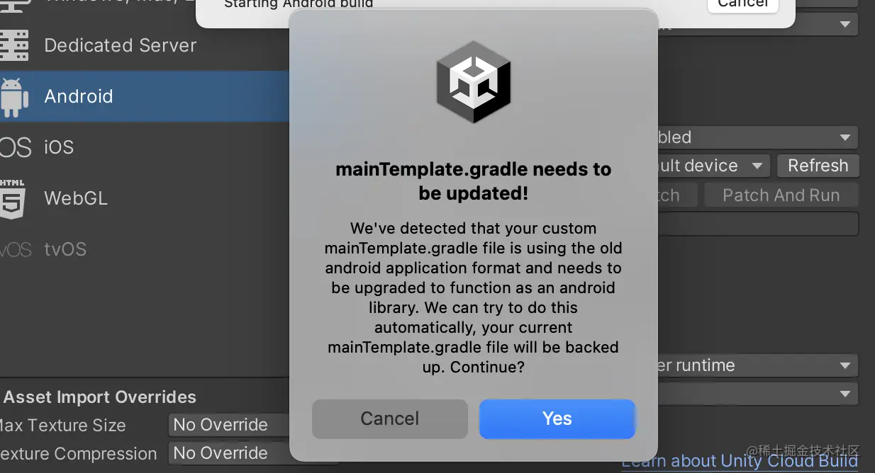 提示mainTemplate.gradle需要更新。这里我们把: Assets/Plugins/Android 'mainTemplate.gradle