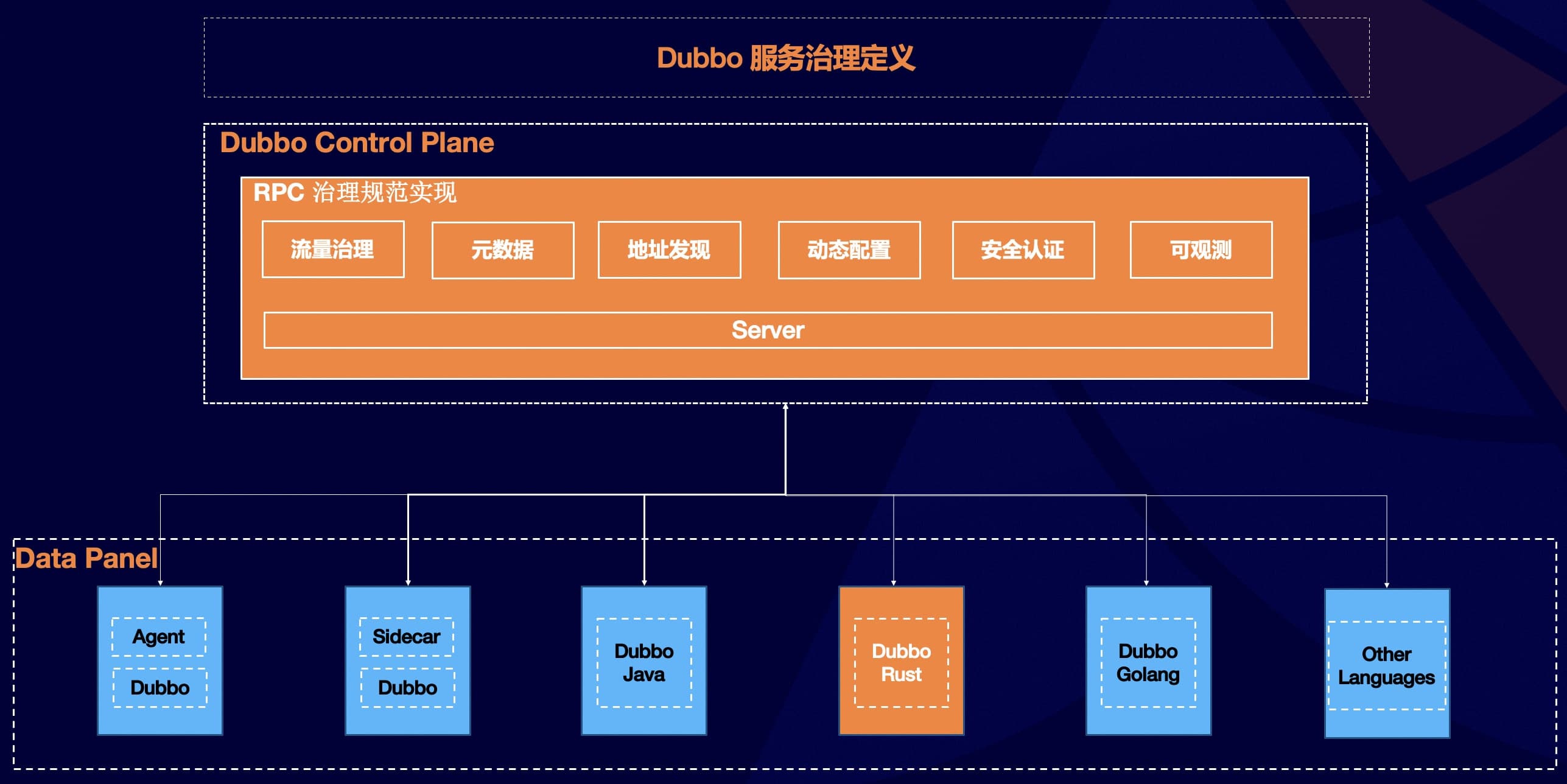 - 第三阶段重点是引入丰富的服务治理能力支持,如流量治理、限流降级、可观测性等,这一目标将主要通过融入 Dubbo Mesh 体系,即适配 Dubbo Mesh 控制面实现。