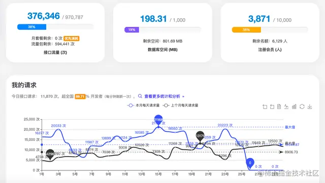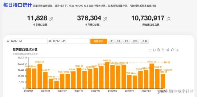 在请求接口后,可以在平台上,实时查看自己每天的接口请求流量。