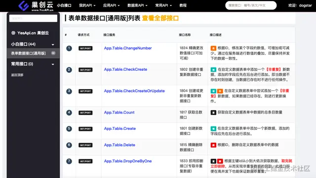 又如,针对数据表单的整套API接口,共有44个,包括有数据的增删改查等接口。