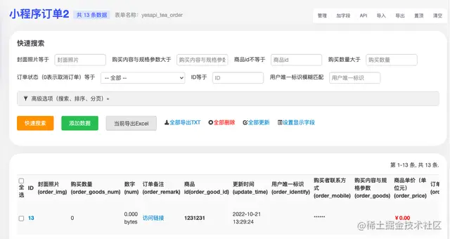 在线数据表单,支持各种操作,例如:添加、导入、导出、批量更新、查看、搜索、查看JSON数据等。