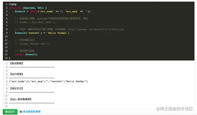 API接口代码,使用PHP,平台可以自动生成接口代码,你也可以在线修改,调试和测试。
