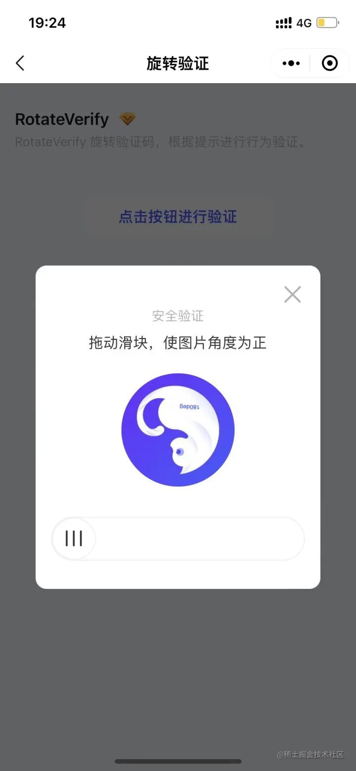 旋转验证模式目前用的也比较多了,通过拖动滑块,使图片角度为正来验证行为。