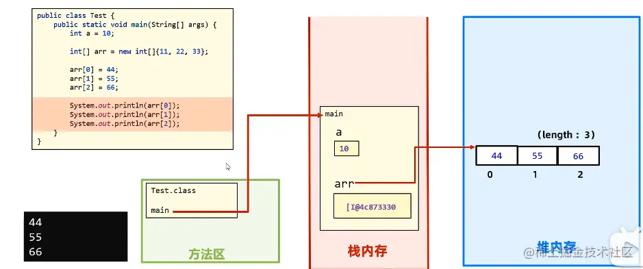 int[] arr = new int[]{11, 22, 33}; System.out.println(arr[2]); // System.out.println(arr[3]) // 出现异常 -