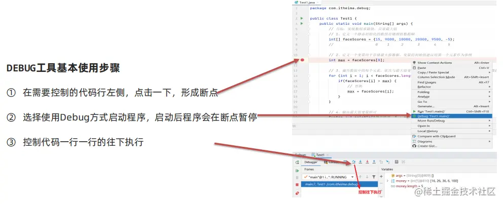 IDEA自带的断点调试(排错)工具,可以控制代码从断点开始一行一行的执行,然后详细观看程序执行的情况。