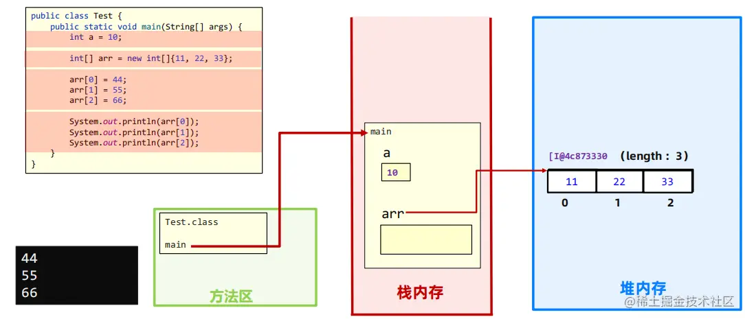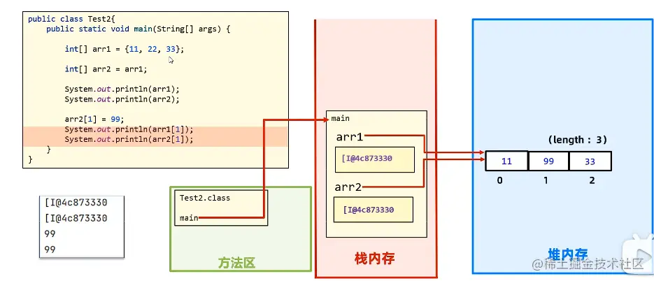注意:数组变量名中存储的是数组在内存中的地址,数组是引用类型
