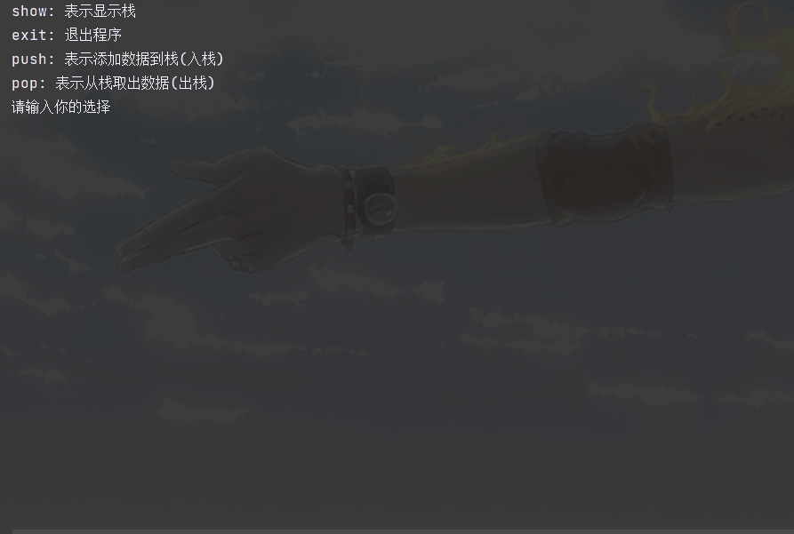 System.out.println("pop: 表示从栈取出数据(出栈)");