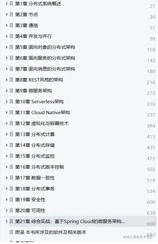 内容包括节点、通信、并发与并行、面向对象的分布式架构、面向服务的分布式架构、面向消息的分布式架构、REST风格的架构、微服务架构、Serverless架构、Cloud Native架构、虚拟化与容器技术、分布式计算、分布式存储、分布式监控、分布式版本控制、数据一致性、分布式事务、安全性、可用性等。