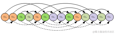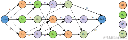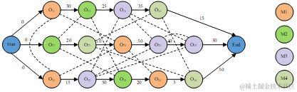 下图为一个简单的析取图模型,其中圆圈表示工序节点,节点内容表示工序名称,数字代表第几个零件的第几道工序,例如O11表示第1个零件的第1道工序。具有相同颜色的工序节点说明该类工序需要相同的机床。弧上的权重表示工序的加工时间。