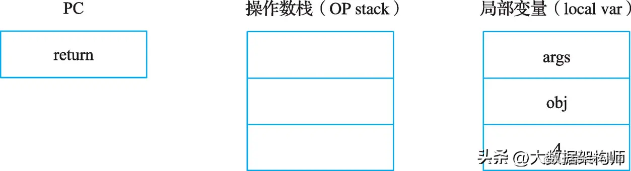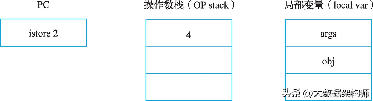 caller(此例中为main函数)接下来执行istore 2指令,将操作数栈中的值出栈并存放在局部变量表中的第2个槽位中。PC、操作数栈和局部变量的状态如图1-20所示。