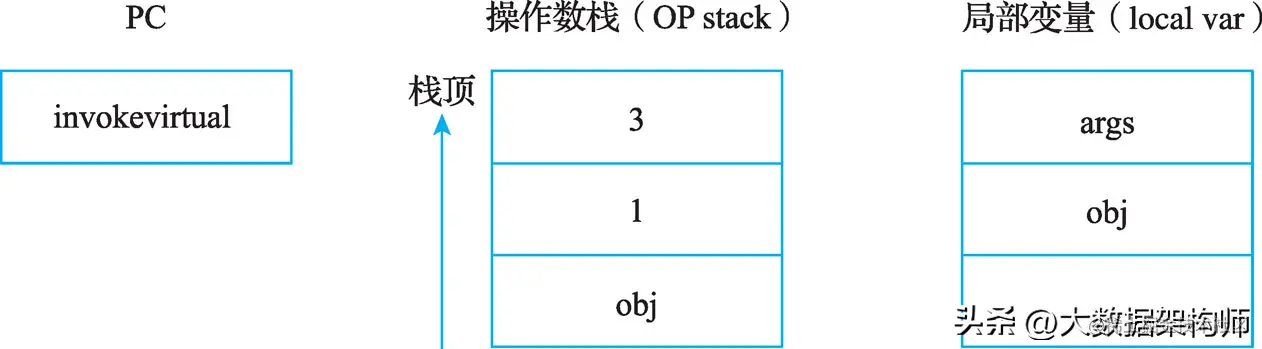 在执行invokevirtual前需要将参数放入操作数栈中,参数的顺序是对象、参数1、参数2……,参数的顺序和方法描述的保持一致。此时PC、操作数栈和局部变量的状态如图1-15所示。