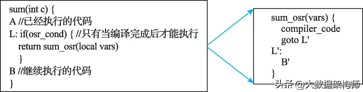 图中还有一个尚未解决的问题,从L处调用sum_osr时需要传递参数,那么此时参数可能有哪些?由于函数sum已经执行了部分代码,因此变量res和i已经不再是初值,并且res和i都将在编译代码中被使用,同时变量c也将在编译代码中被使用。这里假设执行50次后开始执行编译代码,所以i=50,此时res=1225(res=1+2+…+49=1225),另外,在解释执行时还会使用操作数栈,这些内容都将作为参数传递给编译优化的代码。