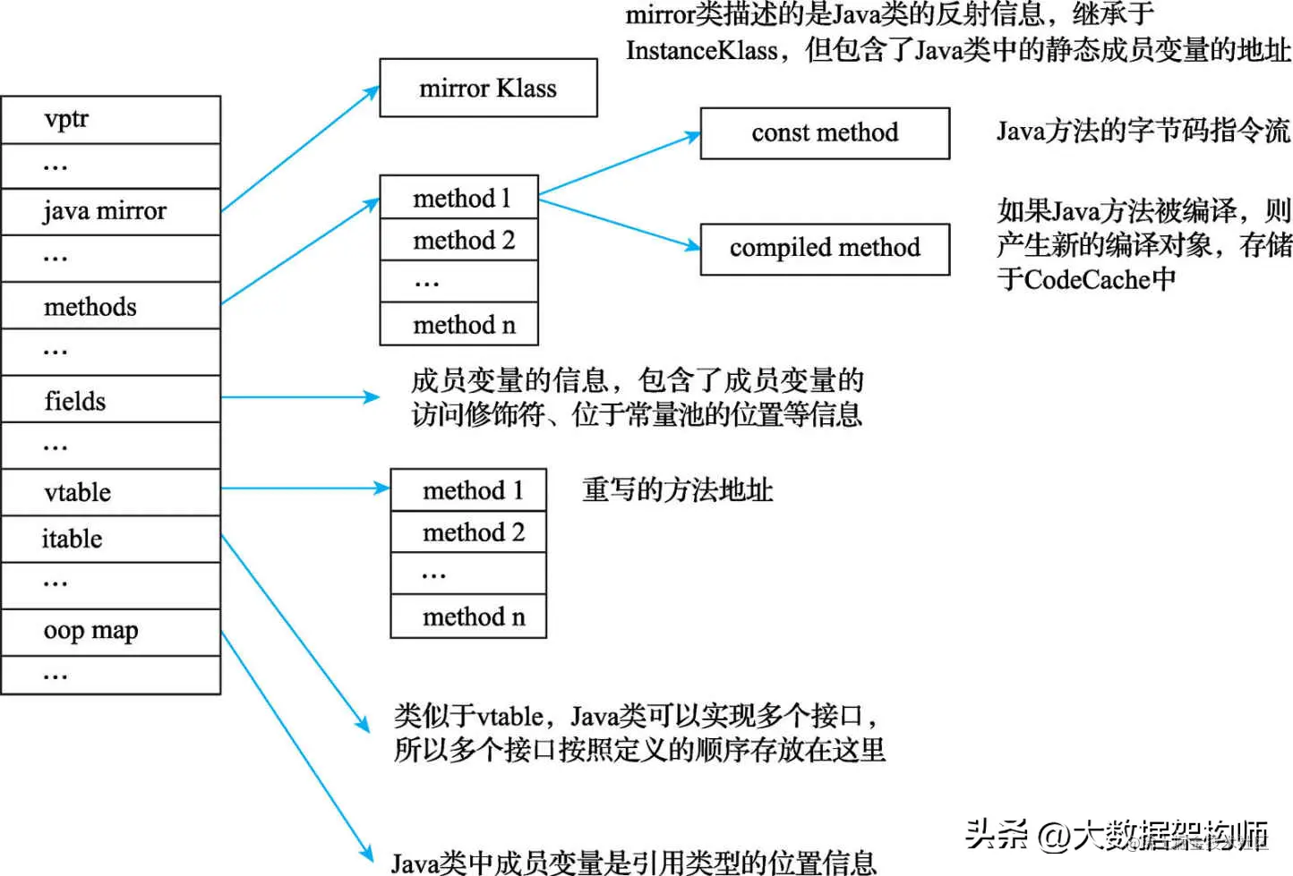 1)JVM加载并解析字节码,或者JVM加载可执行文件,并解析可执行文件。为了能执行编译后的字节码,JVM中实现了一套多态处理的机制,类似于C++编译器中的虚指针、虚函数表。在介绍C++编译器时,提到了编译器把虚函数表放在数据段中,代码位于代码段。这些内容在JVM中是如何实现的?简单地说,可以认为虚函数表等信息是Java类的描述信息,而这些信息只需要保存一份即可,所以JVM设计了所谓的Klass,用于保存Java类中的描述信息。