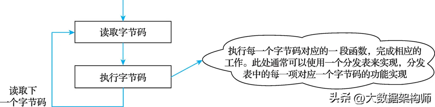 解释器的实现也非常简单,执行过程中针对每一条字节码执行一段相应的逻辑。一个典型的解释器实现流程图如图1-21所示。