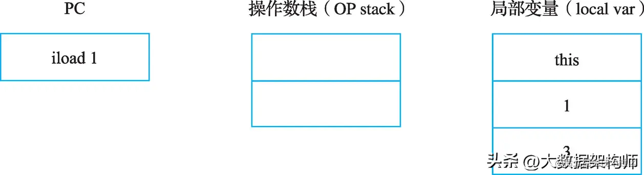 当执行iload 1和iload 2时,PC、操作数栈和局部变量状态如图1-17所示。