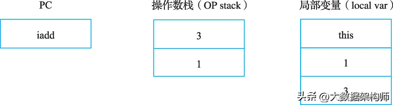 当执行iadd时,根据JVM规范会将操作数栈中的两个对象弹出,然后执行add操作,并将执行的结果放入操作数栈顶。此时PC、操作数栈和局部变量的状态如图1-18所示。