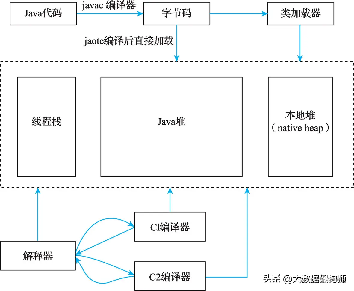 3)JVM还提供了编译执行的方案,其执行方法是把一个Java函数对应的字节码或者字节码片段翻译成一段目标机器指令,在翻译的过程中还进行了编译优化,从而达到高效执行的目的。为了平衡编译时长和执行时长,JVM提供了两种编译器C1和C2。C1编译时间短但编译后的代码质量略低,C2编译时间长但编译质量高。