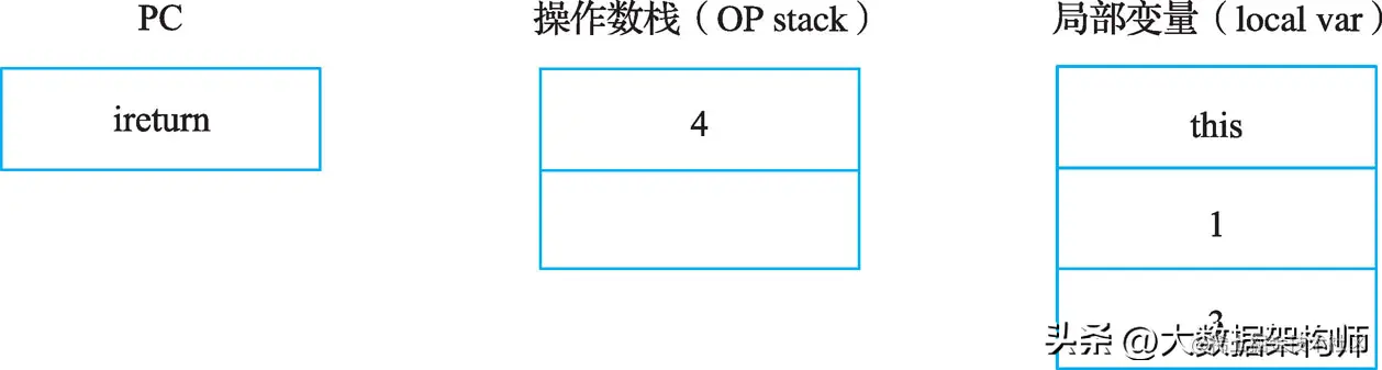 执行字节码ireturn时需要返回到调用者(caller)中,JVM规范中规定返回值从被调用者(callee)的栈帧出栈,然后入栈到caller的操作数栈中,callee栈帧中的其他值都被丢弃。解释器会切换至caller的栈帧,并将执行权交给caller。执行ireturn后caller的PC、操作数栈和局部变量的状态如图1-19所示。