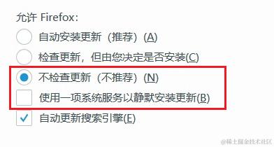 Firefox 默认会自动更新,所以首次进入需要设置不检查更新、取消后台更新服务。