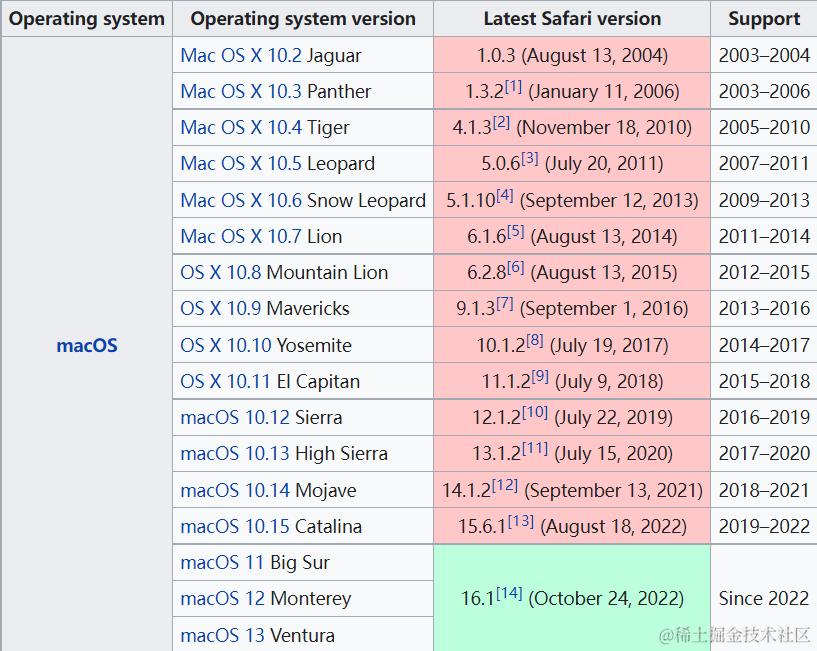 由于浏览器更新日志不全,无法找到所有版本号对应的内核,目前看到内核普遍落后 Chrome 两年左右,所以不严格推算以需要兼容的时间点往前推两年即可。