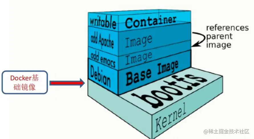 我们可以理解成一开始内核里什么 都没有,操作一个命令下载debian,这时就会在内核上面加了一层基础镜像;再安装一个emacs,会在基础镜像上叠加一层image;接着再安装一个apache,又会在images.上面再叠加一层image。最后它们看起来就像一“个文件系统即容器的rootfs。在Docker的体系里把这些rootfs叫做Docker的镜像。但是,此时的每一层rootfs都是read-only的,我们此 时还不能对其进行操作。当我们创建一个容器,也就是将Docker镜像进行实例化,系统会在一层或是多层read-only的rootfs之上分配一层空的read-write的rootfs。
