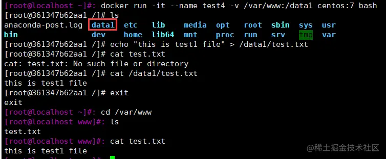 docker run -it --name test4 -v /var/www:/data1 centos:7 bash