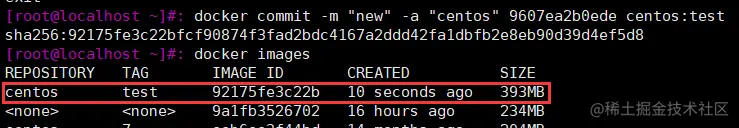 docker commit -m "new" -a "centos" 9607ea2b0ede centos:test#常用选项: -m说明信息: -a作者信息; -p生成过程中停止容器的运行