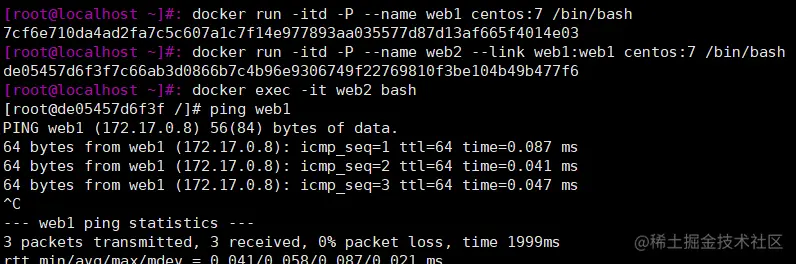 docker run -itd -P --name web2 --link web1:web1 centos:7 /bin/bash #--link容器名:连接的别名