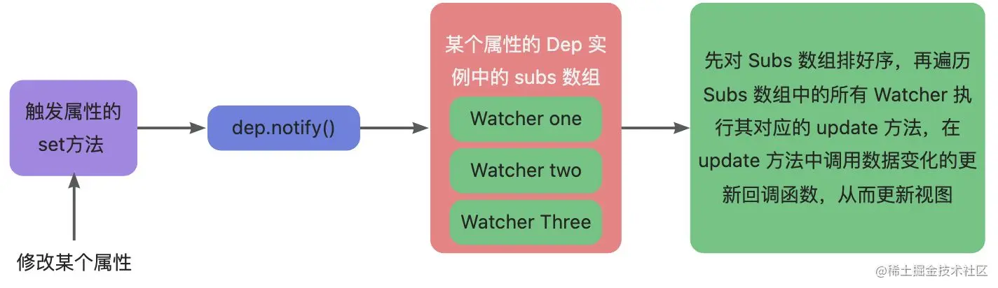 setter触发时,通知watcher,从而使它关联的组件重新渲染。 【 派发更新 】