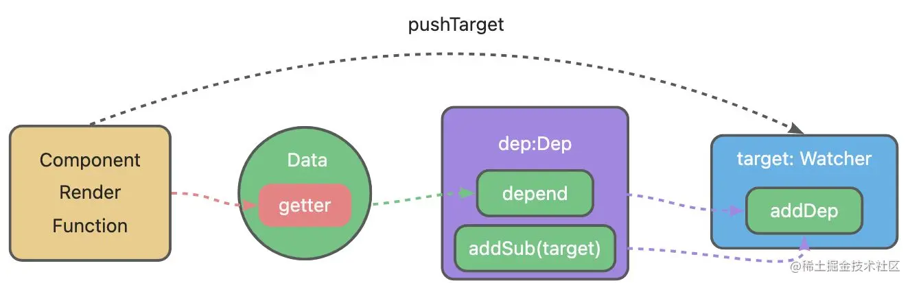 watcher实例,它会在组件渲染的过程中把“接触”过的数据 property 记录为依赖。 【 依赖收集 】 - 之后当依赖项的