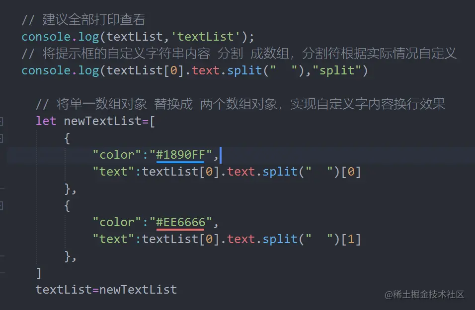 // 将提示框的自定义字符串内容 分割 成数组,分割符根据实际情况自定义