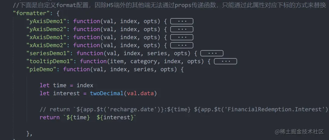 实现: 遇到问题,优先想到通过官方文档解决。于是继续查找官方文档,在文档-基本配置-组件props中,存在tooltipFormat属性,可以用来自定义格式化Tooltip显示内容。有了思路起点之后,继续去网上搜索tooltipFormat属性详细用法,了解到在目录uni_modules\qiun-data-charts\js_sdk\config-ucharts.js配置文件中,修改cfu对象-formatter对象-pieDemo函数的返回值,即可自定义内容。