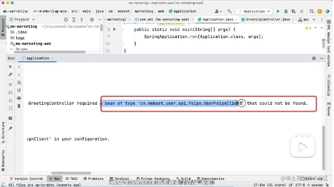 然后,将模块ms-user-api替换为ms-user-spring-boot-starter依赖,则会报错,如下: