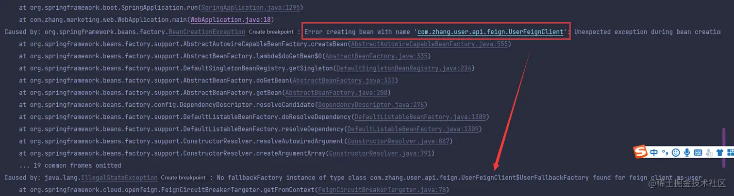 测试熔断器的功能,初始时会报错,这是因为ms-marketing-web只会扫描当前项目的package,此时需要在ms-user-autoconfigure的自动配置类MsUserAutoConfiguration中使用@Import注解导入@Import({UserFeignClient.UserFallbackFactory.class})用于熔断处理的类,并且在ms-marketing-web的启动类上添加@ComponentScan(basePackageClasses = UserFeignMarker.class),程序能运行,但无法访问 http://localhost:12080/hello/10001。