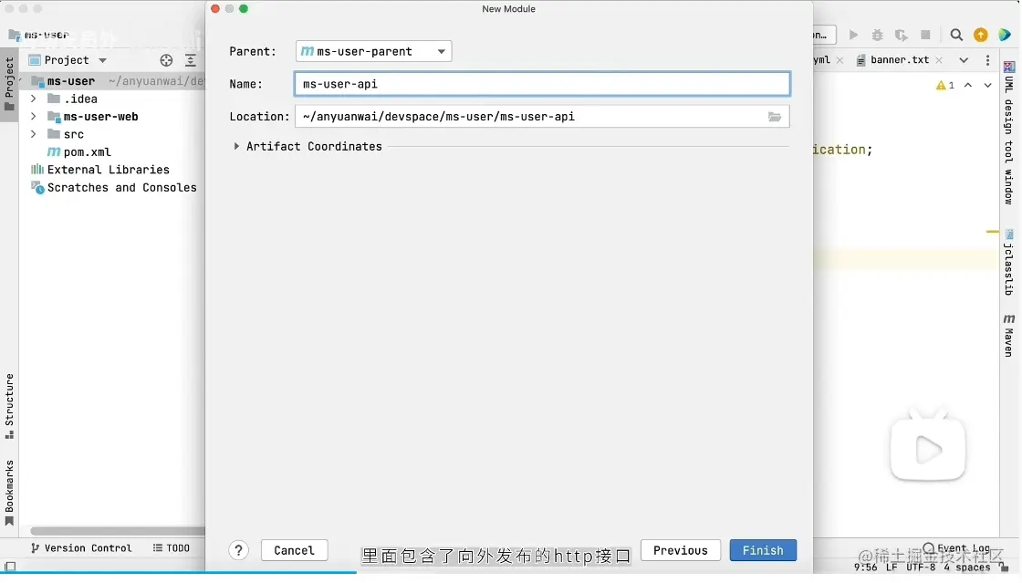 然后,新建一个模块ms-user-api,它里面包含了向外发布的HTTP接口和相关的参数与返回类型。