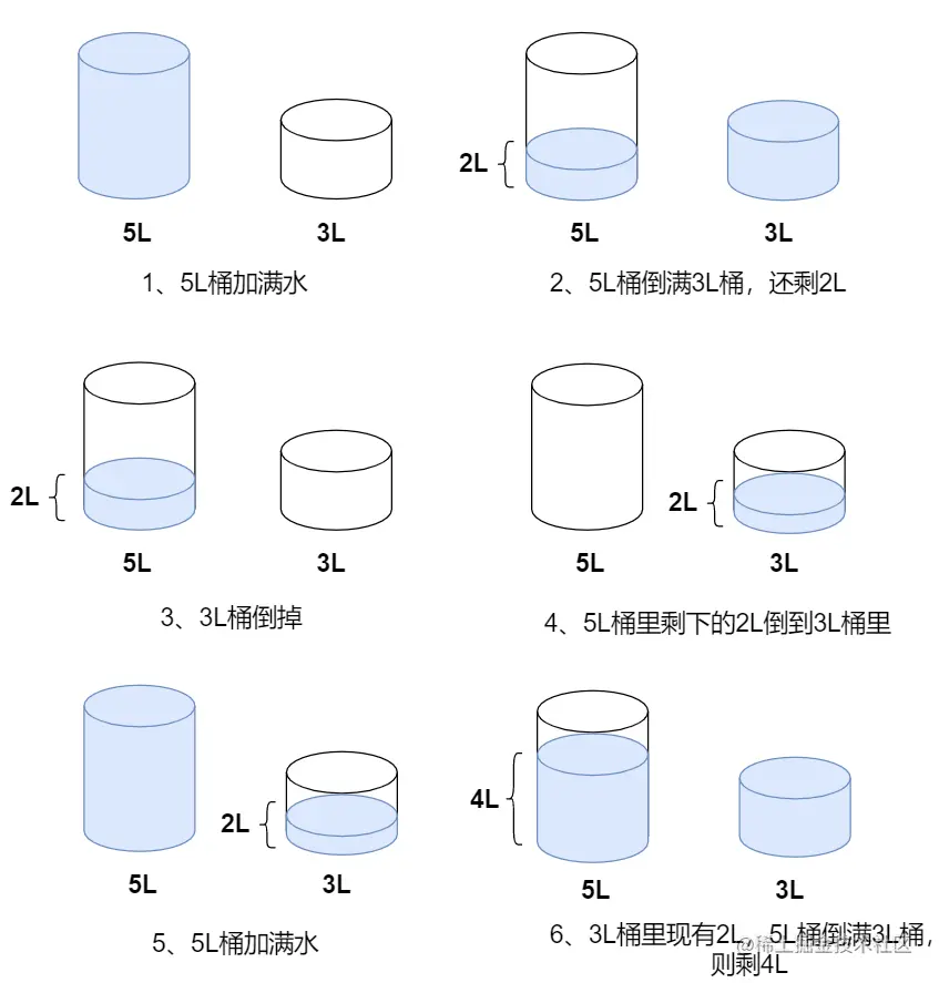 - 5L水桶倒空, 将6L水桶中剩余2L水倒入5L水桶;