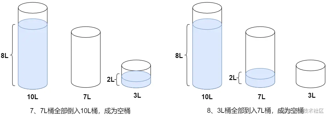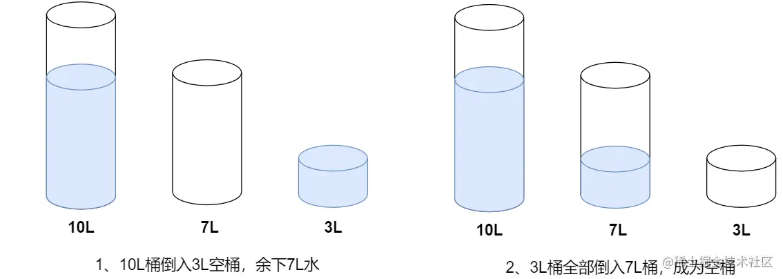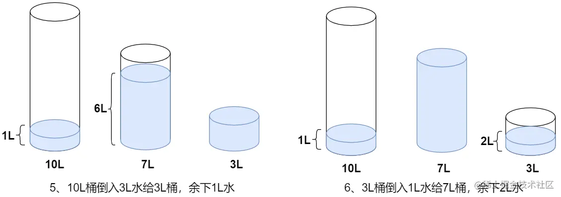 - 10L桶倒入3L水给3L桶,余下1L水;