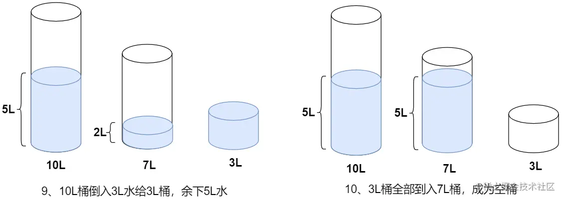 - 10L桶倒入3L水给3L桶,余下5L水;