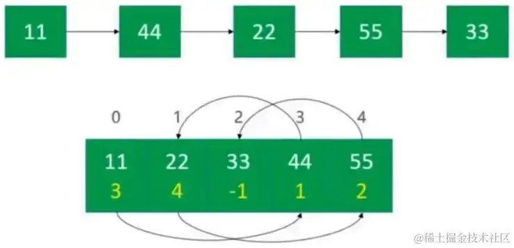 - 数组的每个元素存放2个数据:值、下个元素的索引