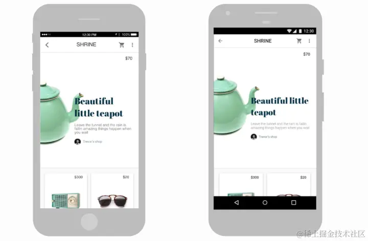 这是一个来自Gallery的演示应用程序, 您可以在安装Flutter并设置好环境后运行Flutter示例应用程序。“Shrine”示例拥有高质量的滚动图片、互动卡片、按钮、下拉列表和购物车页面。 要查看这个和更多示例的代码,请访问我们的GitHub。
