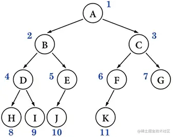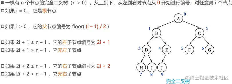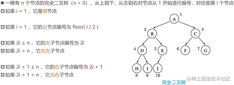 :对节点从上至下、左至右开始编号,其所有编号都能与相同高度的满二叉树中的编号对应