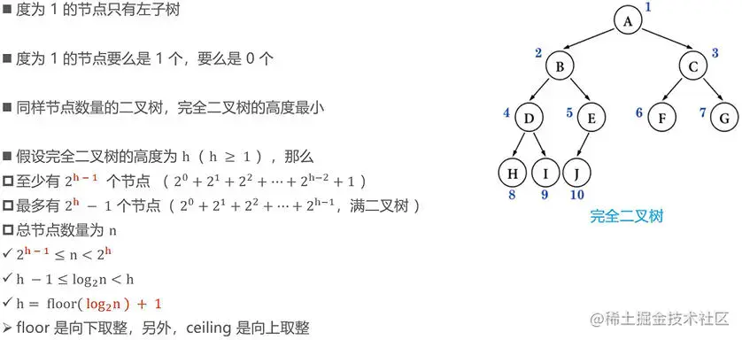 - 在同样高度的二叉树中,满二叉树的叶子节点数量最多、总节点数量最多