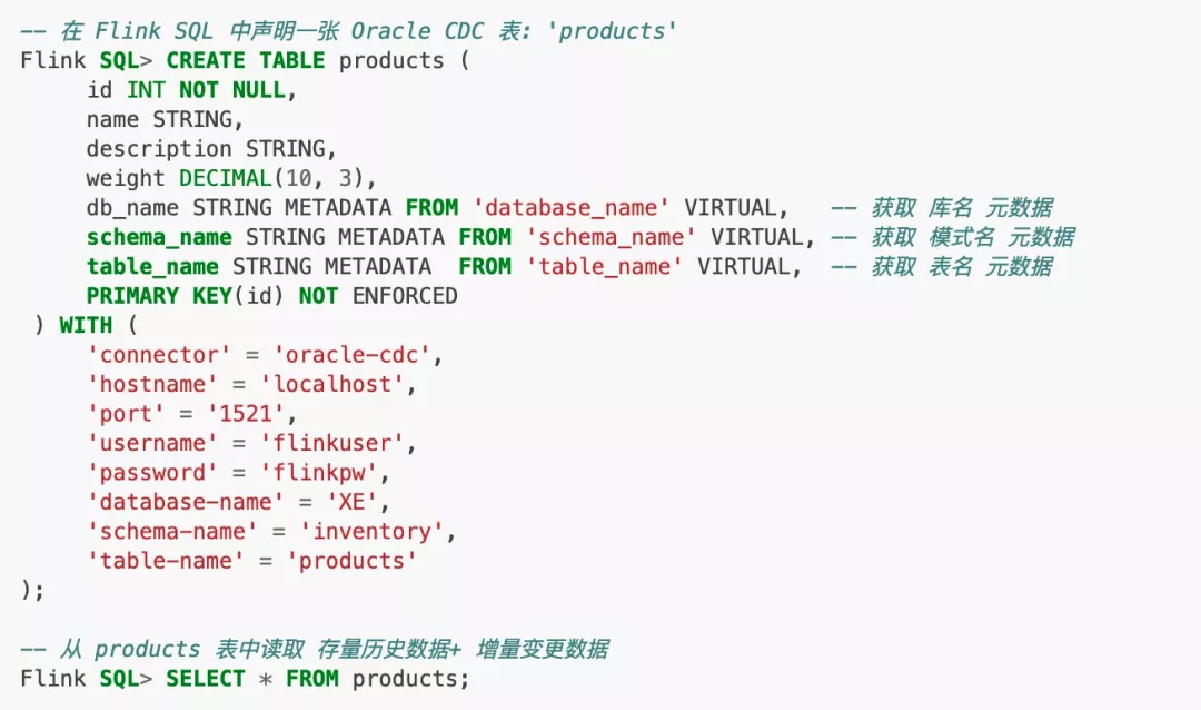 用户可以在 Flink DDL 中通过 db_name STRING METADATA FROM 'database_name' 的方式来访问库名(database_name)、表名(table_name)、变更时间(op_ts)等 meta 信息。这对分库分表场景的数据集成非常实用。