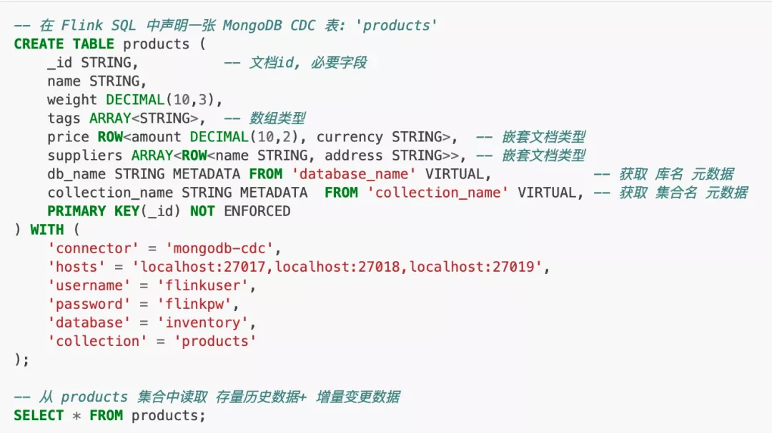 使用 MongoDB CDC 连接器,用户只需要声明如下 Flink SQL 就能实时捕获 MongoDB 数据库中的全量和增量变更数据,借助 Flink 强大的集成能力,用户可以非常方便地将 MongoDB 中的数据实时同步到 Flink 支持的所有下游存储。